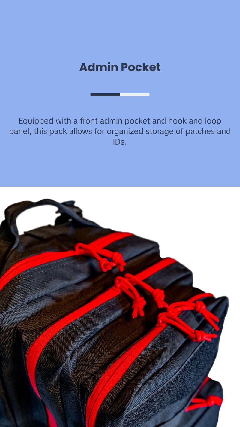 - Front admin pocket with a hook and loop panel for patches or ID.