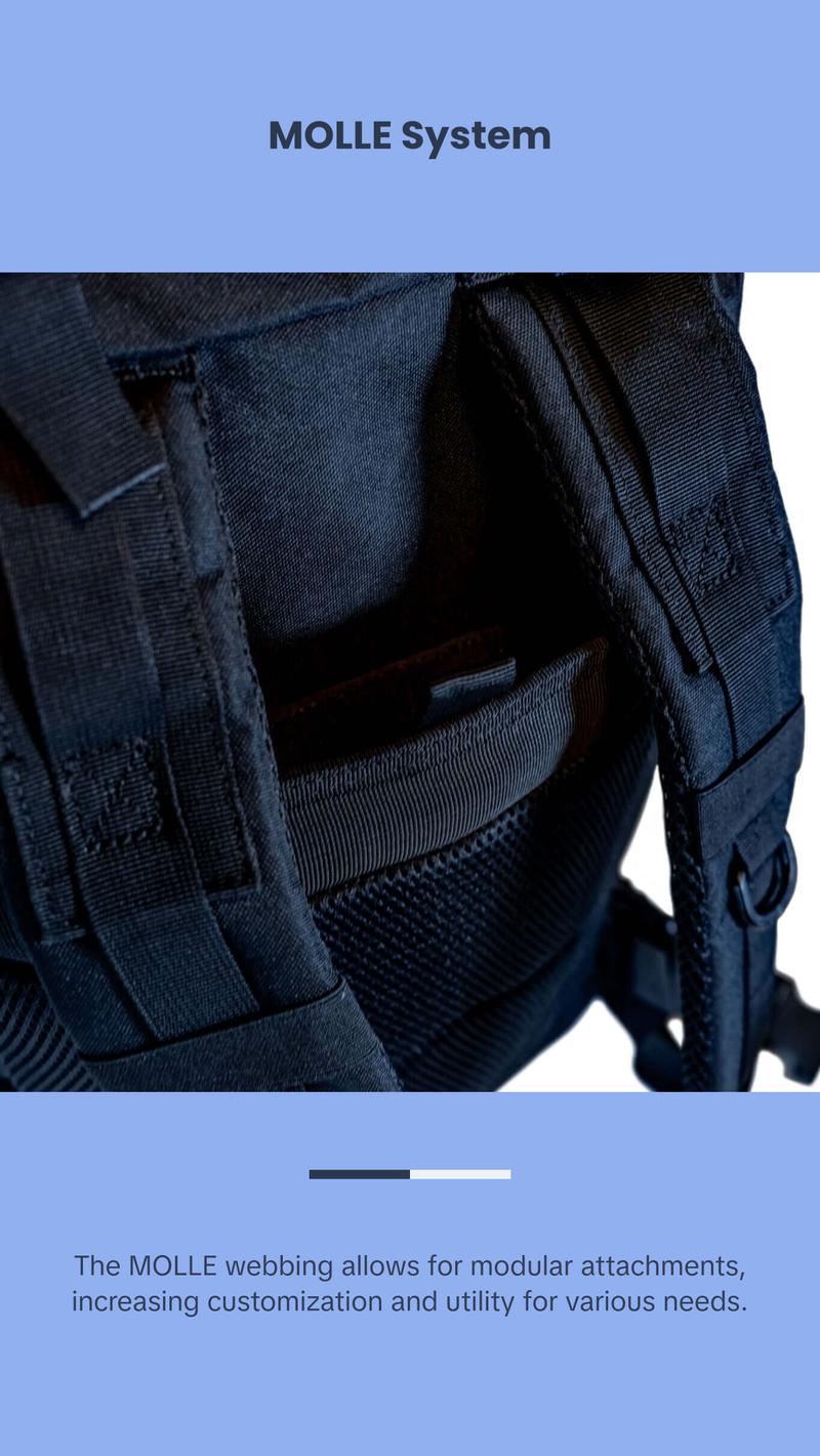 - Compression straps maintain a balanced load. MOLLE webbing allows modular attachments. A reinforced top grab handle adds convenience.